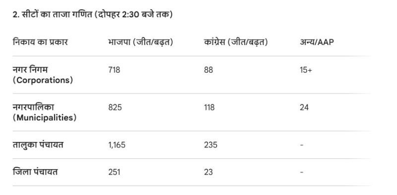 अहमदाबाद: मंगलवार सुबह 9 बजे शुरू हुई मतगणना के बाद से ही भाजपा ने निर्णायक बढ़त बना ली थी। दोपहर तक आए नतीजों में पार्टी ने 15 में से 11 नगर निगमों पर कब्जा जमा लिया है, जबकि शेष 4 में भी वह भारी बढ़त के साथ जीत की ओर अग्रसर है।